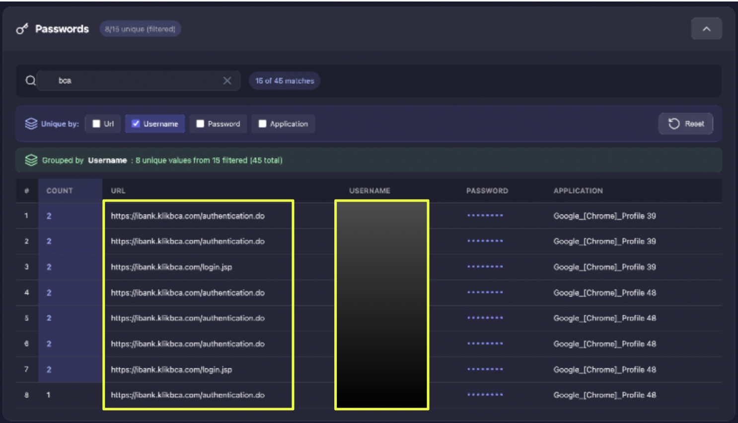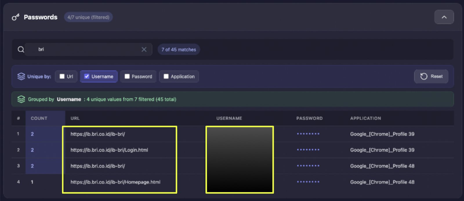 Further analysis of browser autofill data expanded this finding significantly. In total, credentials for 8 distinct KlikBCA accounts were recovered, along with 4 additional Bank BRI accounts. These accounts were not limited to a single session but were stored persistently in the browser, indicating repeated use over time.