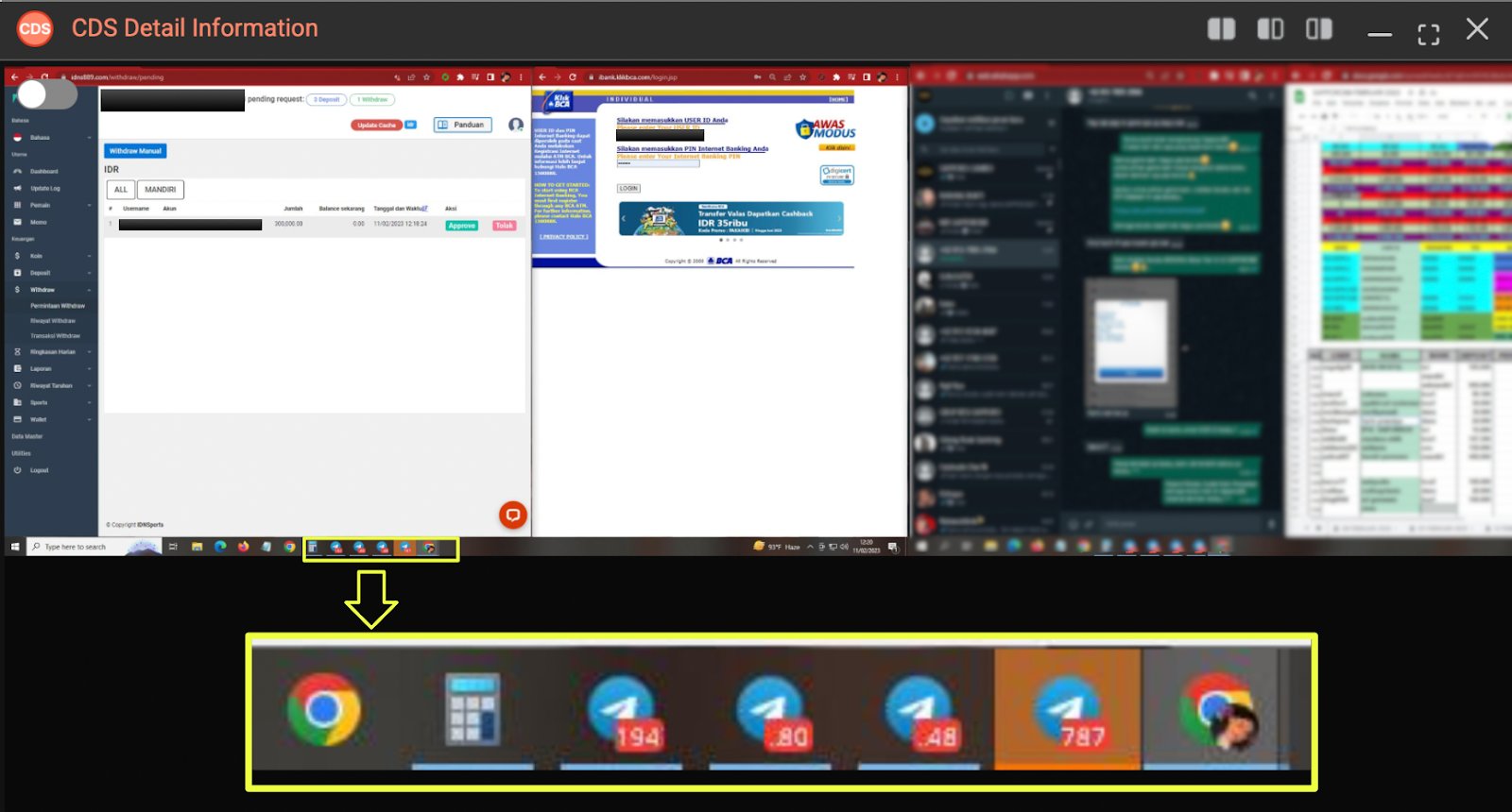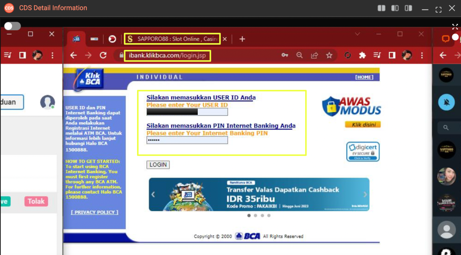 The second monitor captured in the CDS screenshots showed active engagement with Indonesian online banking services, most notably KlikBCA. A login attempt was observed using the username “H**********5”, indicating direct interaction with Indonesian financial infrastructure.