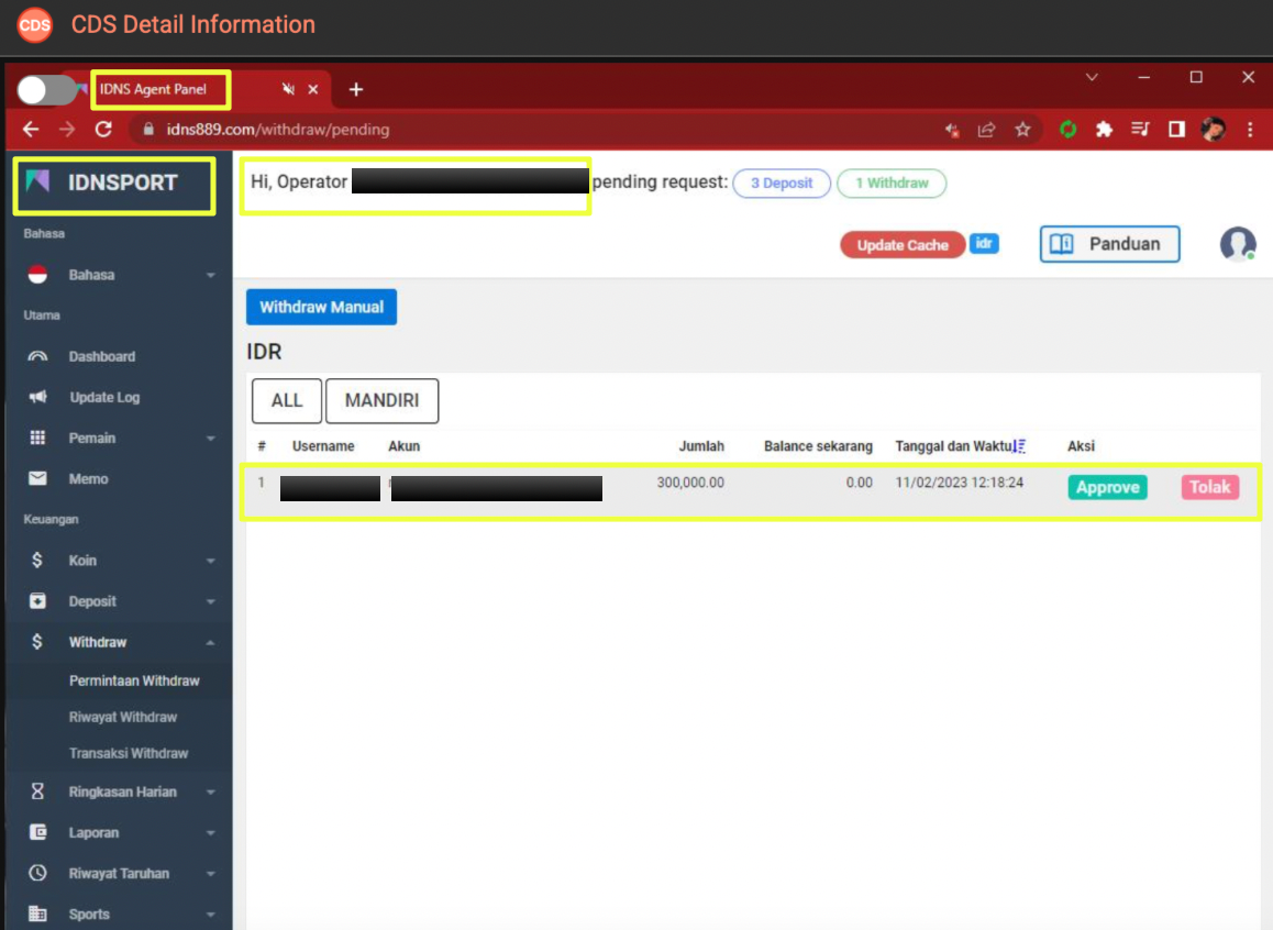 On the first screen, the operator was logged into idns889.com, identified in the presentation as a white-label service for IDN Poker. The interface displayed an “Operator” status banner, indicating administrative-level access. This confirms that the user was not a player or affiliate, but someone with direct control over platform configuration and management functions.