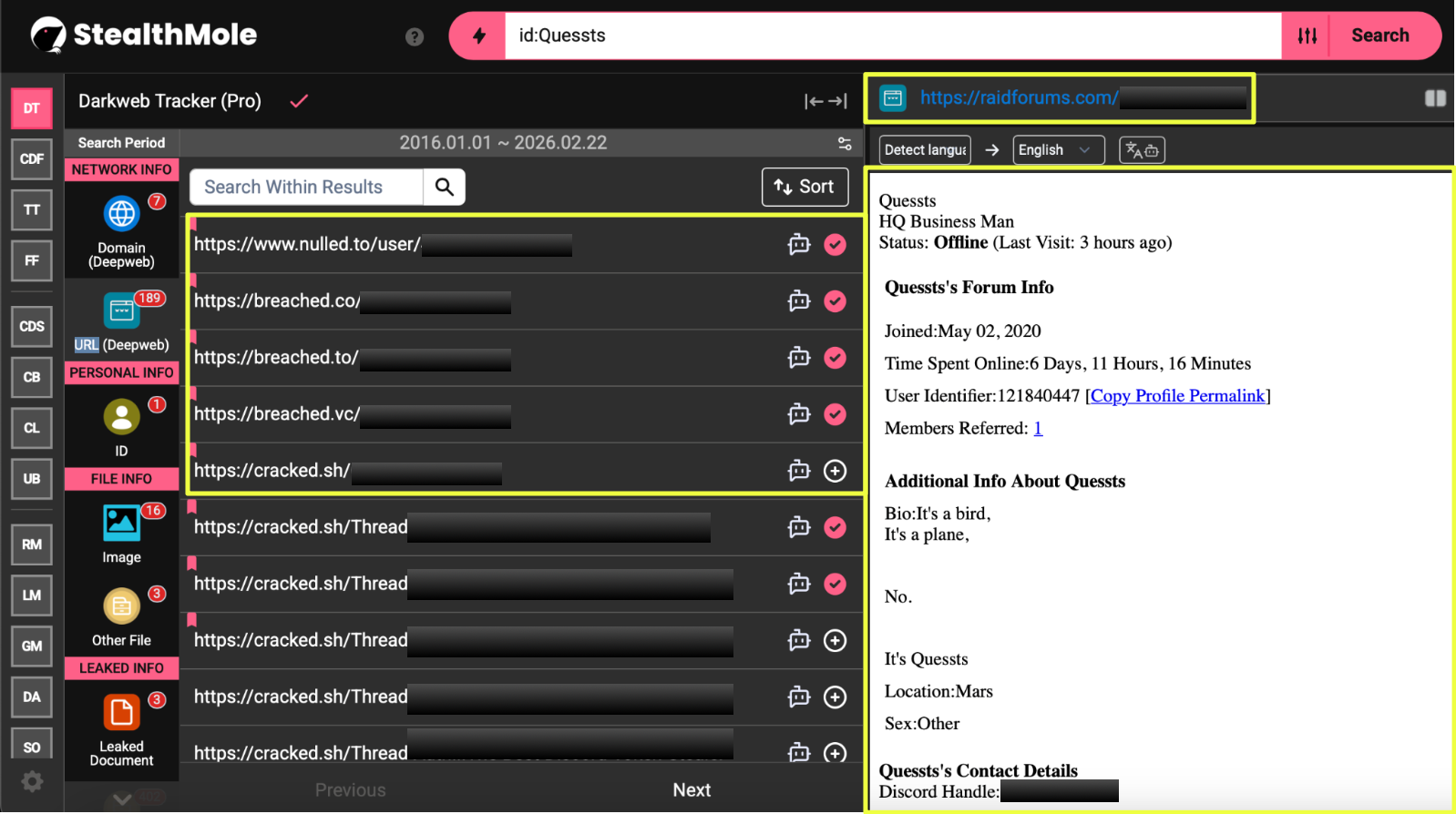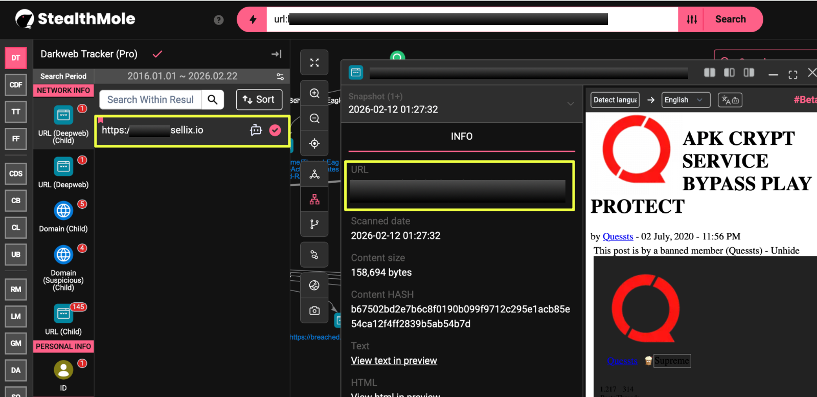 Following the discovery of the APK crypt service on cracked.sh, the next step was to pivot on the alias “Quessts” within StealthMole’s Darkweb Tracker.