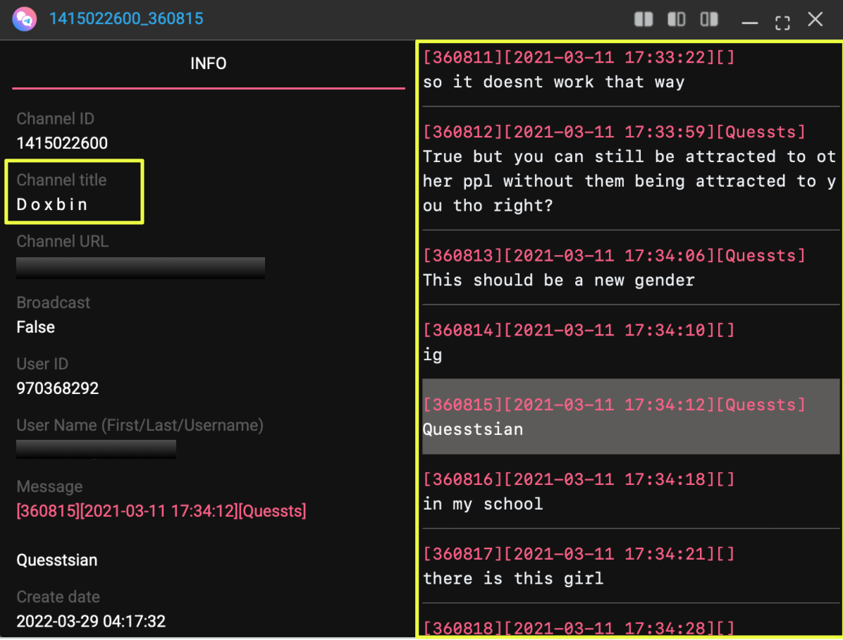 Additional activity was observed within a Telegram channel titled “Doxbin,” where the alias engaged in discussions and technical exchanges: