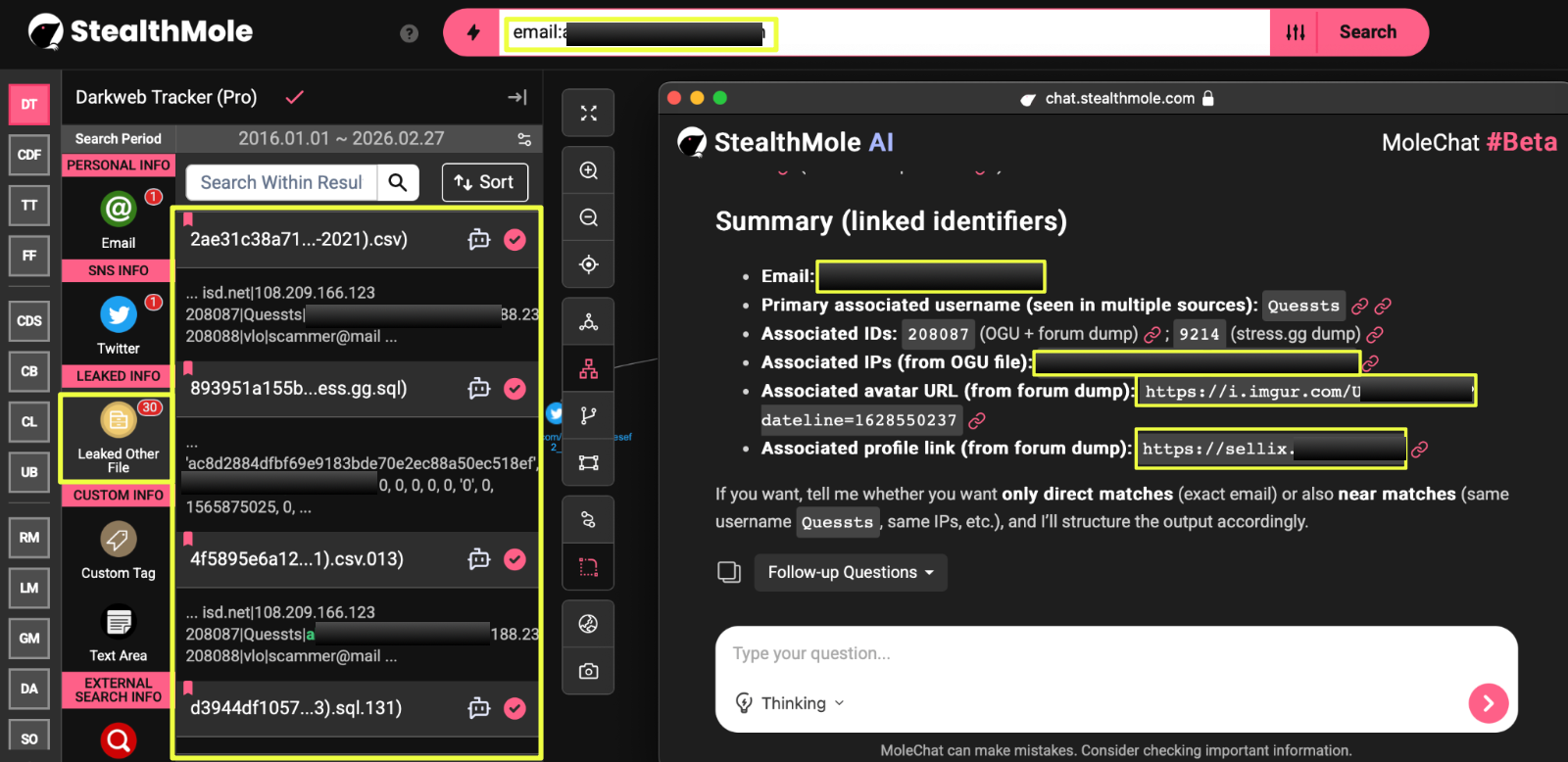 When al*****f2002@gmail.com was queried in StealthMole’s Darkweb Tracker, a leaked document was identified in which the email was directly associated with the username: Quessts. This moved the linkage beyond similarity into documented alias association.