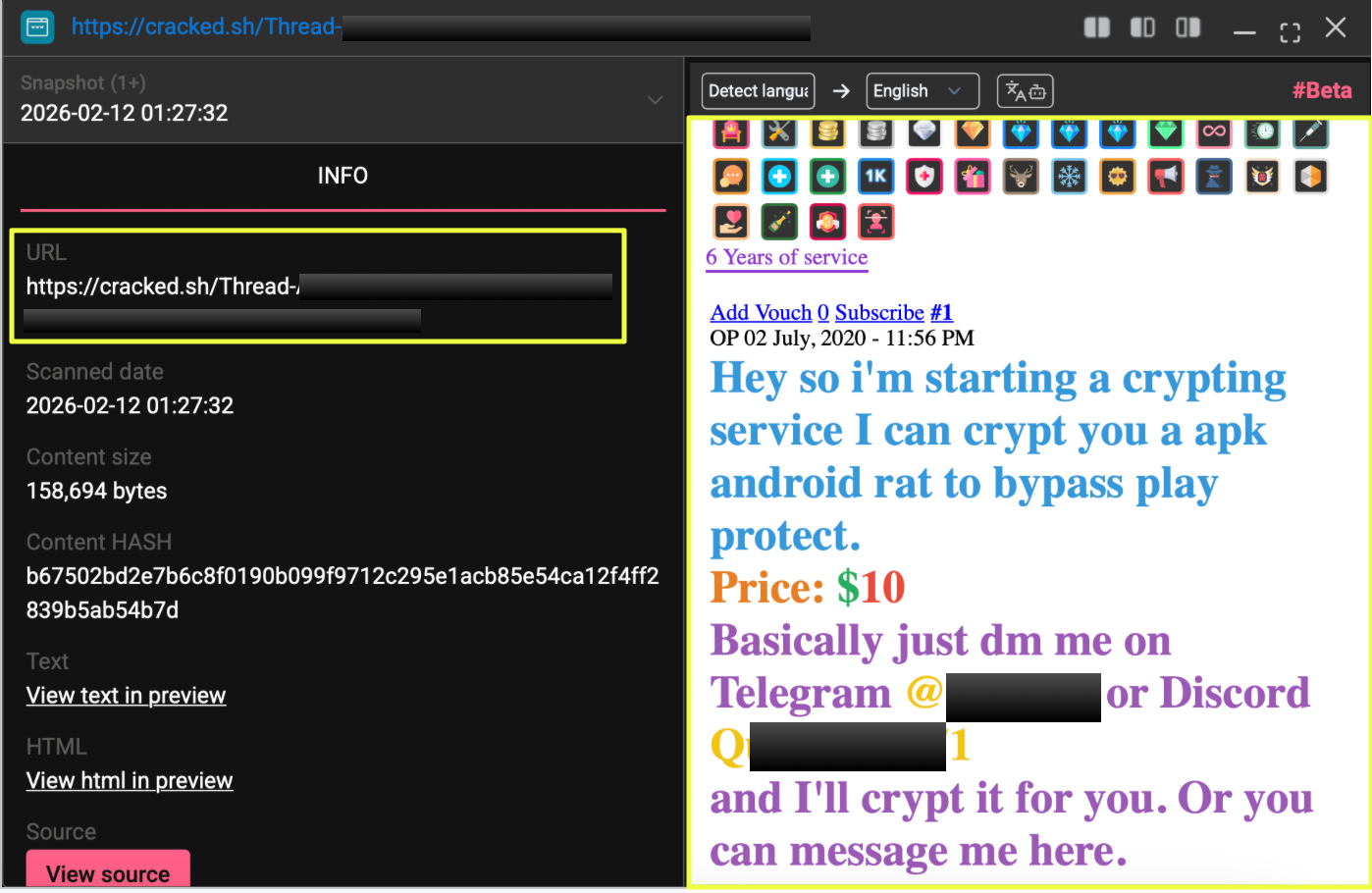 - The cracked.sh thread introduced an Android evasion service.