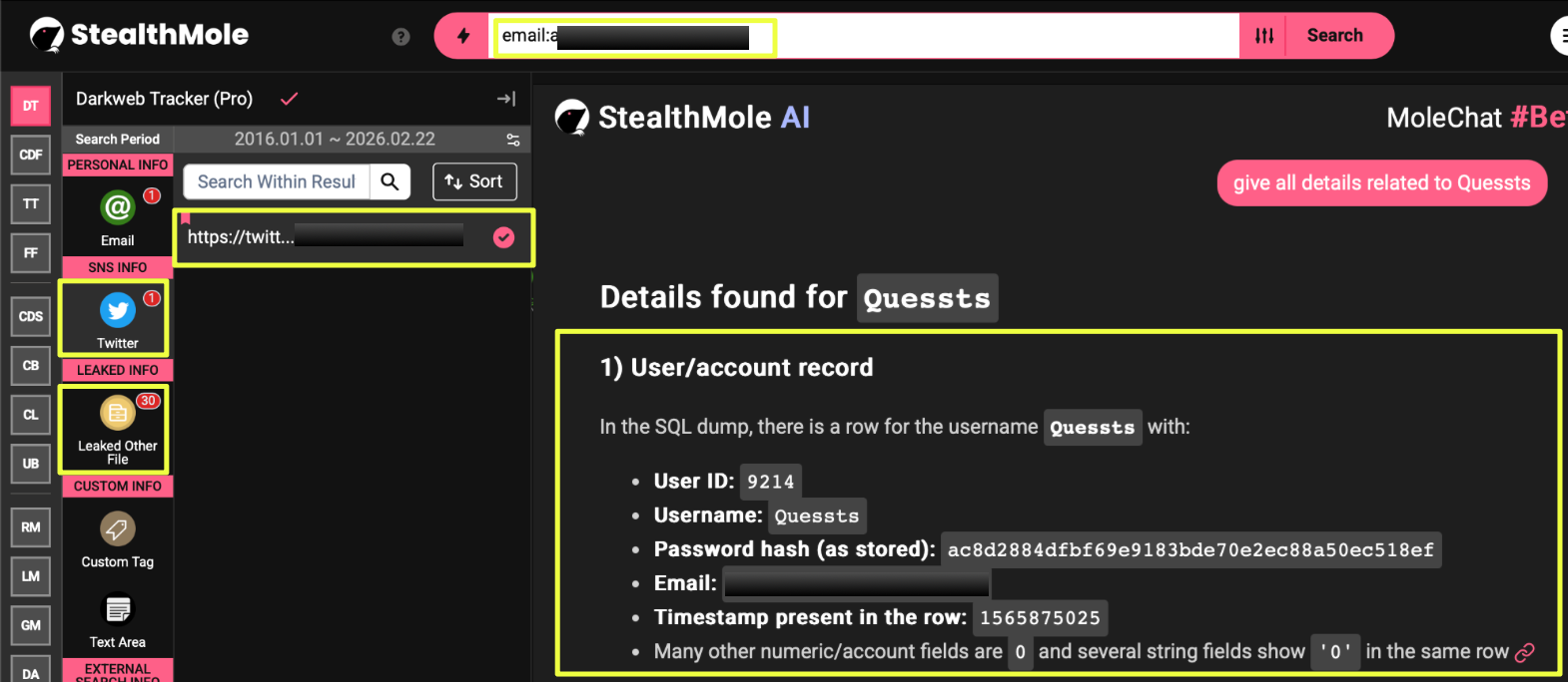 With cross-platform activity established across forums, GitHub, and Telegram, the investigation returned to StealthMole’s Darkweb Tracker to examine whether the alias “Quessts” appeared within structured leak datasets.