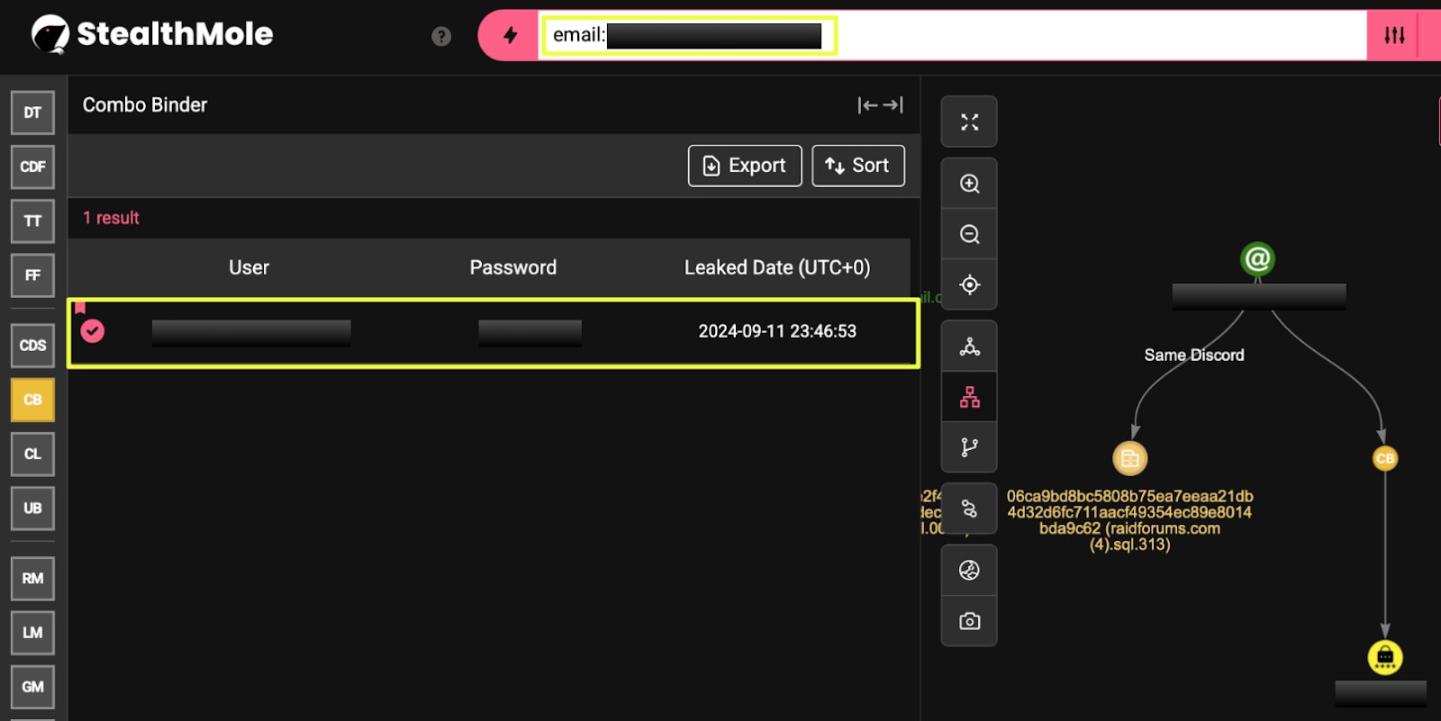To evaluate further correlation, the email address m*******1@gmail.com was analyzed through StealthMole’s Combo Binder. The results indicated credential exposure, including a password string matching the alias “Quessts.”