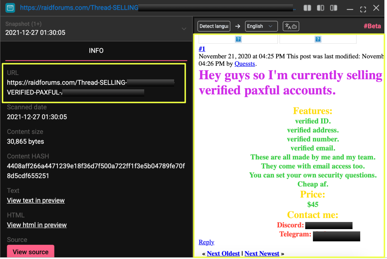 The presence of the Discord handle Q*****1 was particularly significant, as the same contact information appeared in earlier marketplace threads, including the Paxful account sales post.