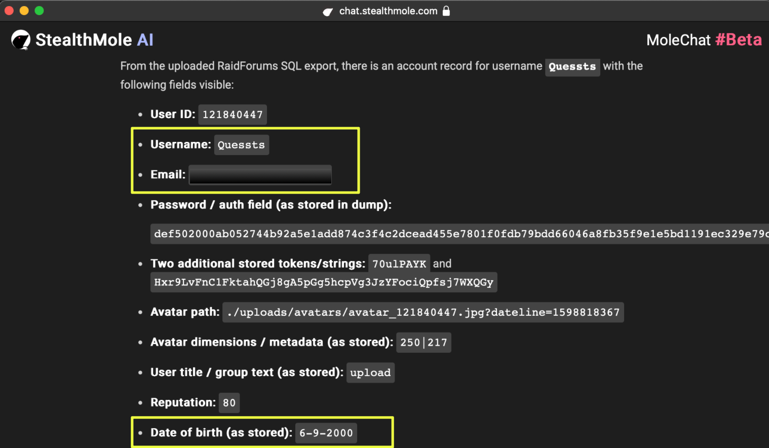 Further analysis of additional leaked datasets produced more concrete linkage. Within a RaidForums SQL leak, a user record under the alias “Quessts” contained the following artifacts: