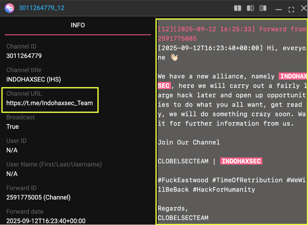 Mapping these accounts and channels provides an initial view of the group’s communication infrastructure. These spaces serve not only as places where IndoHaxSec announces operations but also as hubs where alliances, ideological messaging, and leaked data are publicly promoted.