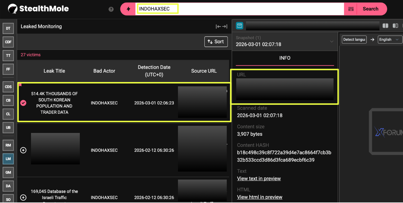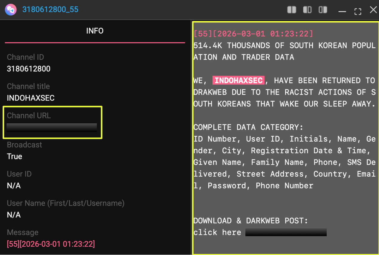 The investigation into IndoHaxSec began after the group appeared in connection with a data leak involving South Korean users. The breach, which was advertised online under the title “514.4K THOUSANDS OF SOUTH KOREAN POPULATION AND TRADER DATA,” drew attention due to both the scale of the dataset and the explicit attribution to IndoHaxSec.