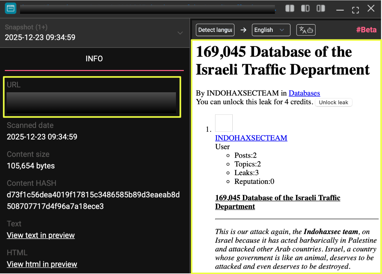 Another dataset advertisement linked to the group was discovered on the forum BreachStars. In this case, the post referenced a database described as “169,045 Database of the Israeli Traffic Department.” The post was attributed to a user named INDOHAXSECTEAM, which appears to be another variation of the group’s name used across platforms.