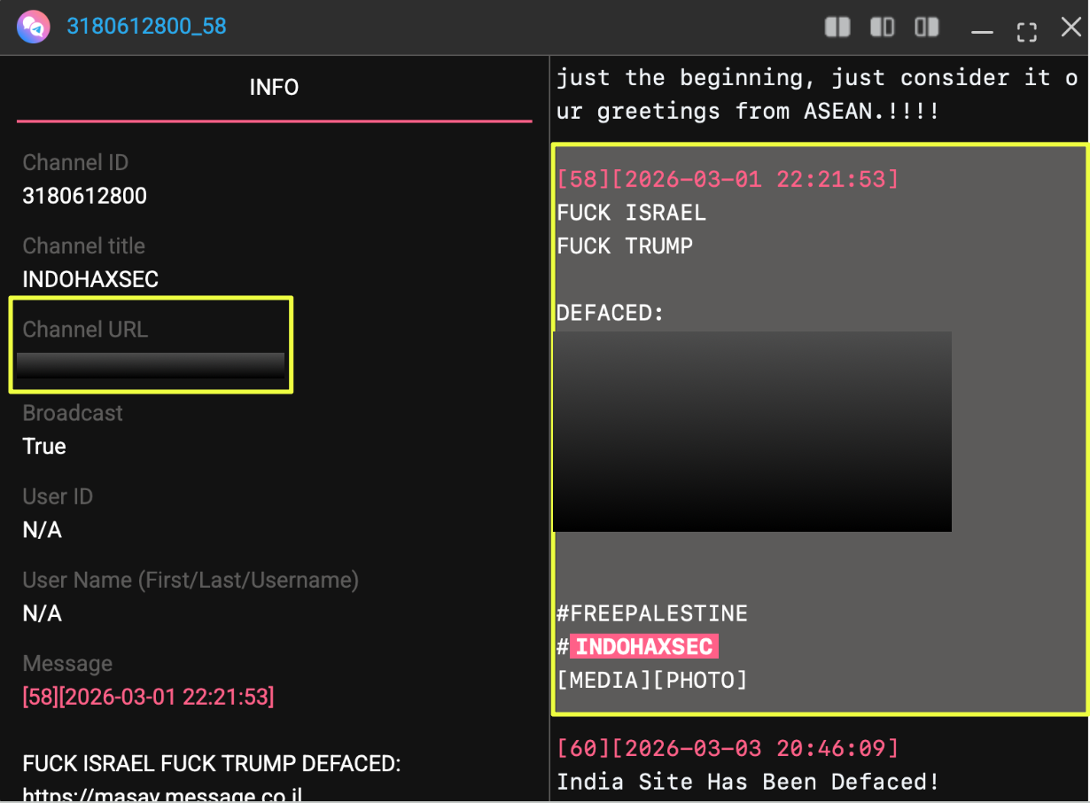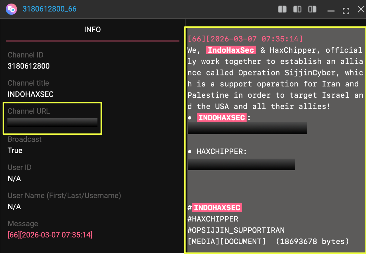 Beyond individual attack claims, Telegram posts also revealed collaborations between IndoHaxSec and other hacktivist groups. On 7 March 2026, the channel https://t.me/Indo****** announced an alliance between IndoHaxSec and another hacktivist collective known as HaxChipper. The message stated that the two groups would work together under an operation referred to as “Operation SijjinCyber,” which was described as supporting Iran and Palestine while targeting Israel, the United States, and their allies.