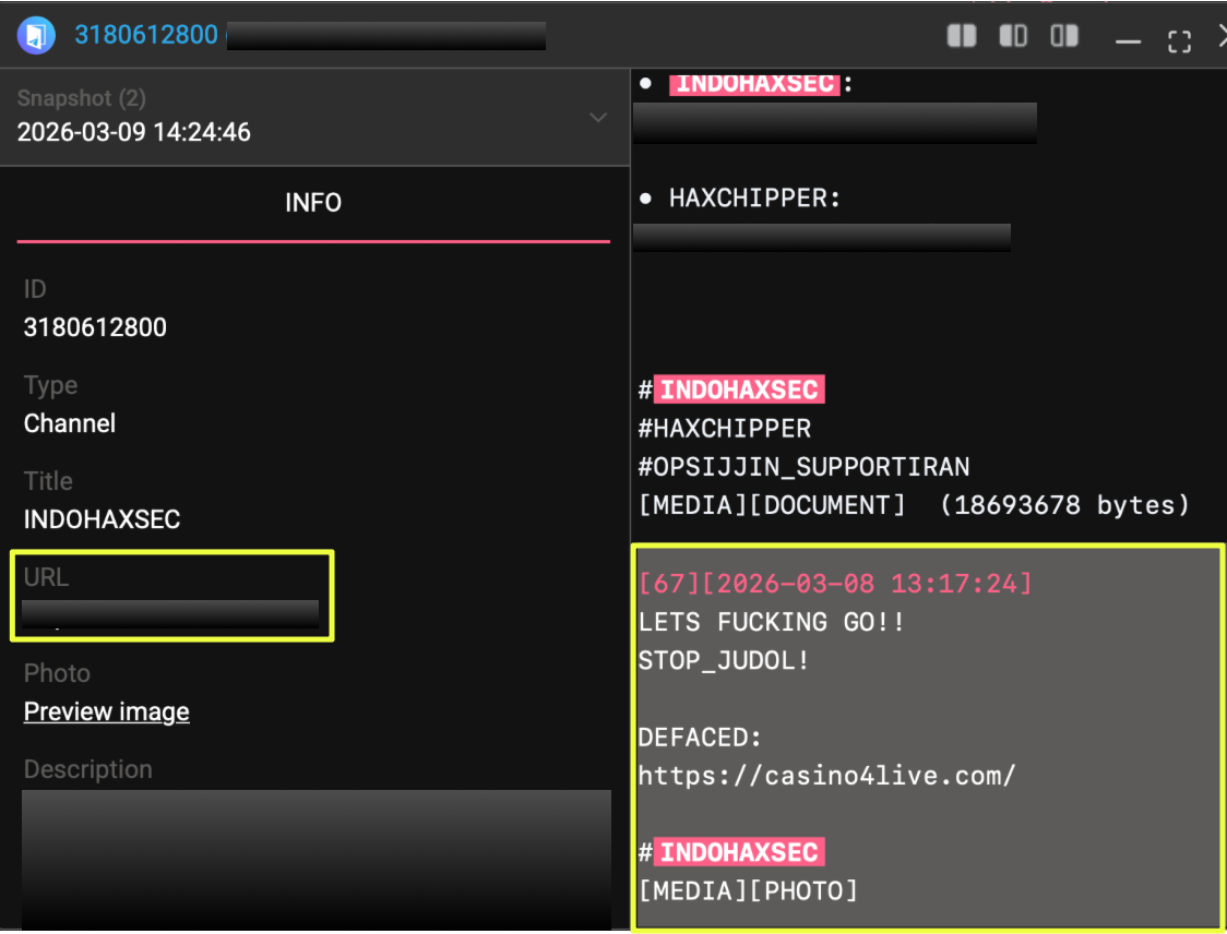 IndoHaxSec has appeared across several online platforms where it promotes its identity, claims cyber operations, and communicates with supporters. Like many hacktivist groups, its presence is distributed across multiple channels rather than centralized in a single space. Messages, attack claims, and other artifacts are shared through social platforms, messaging channels, and underground forums, creating a scattered but traceable digital footprint.