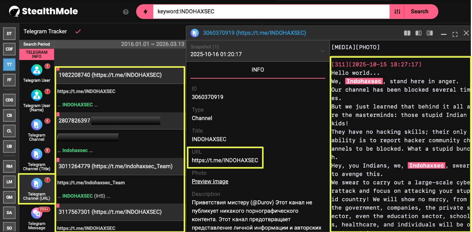 This investigation set out to better understand the online footprint of IndoHaxSec by tracing the group’s presence across multiple digital platforms. Through analysis of artifacts collected from StealthMole monitoring tools, Telegram channels, underground forums, and related communication platforms, the investigation reveals a hacktivist collective that maintains a distributed but visible online ecosystem.