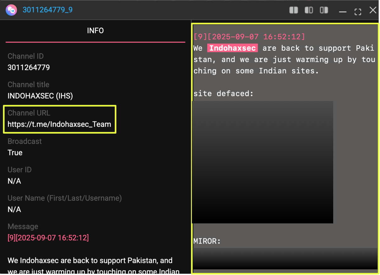 This report traces IndoHaxSec’s digital footprint across several platforms in order to better understand how the group operates, how it communicates, and how it positions itself within the wider hacktivist landscape. By piecing together artifacts from defacement monitoring tools, Telegram channels, leak forums, and other open sources, the investigation reveals an expanding network of activity that goes well beyond isolated attack claims.